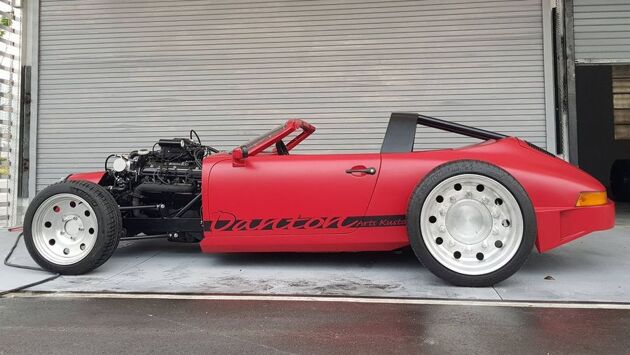 Как видно на фото, от классического Porsche 911 в этой машине осталось мало. Так, суперкар полностью избавили от крыши, заменив ее на самодельную «дугу безопасности» — как у 911 Targa. Также был увеличен угол наклона лобового стекла. А для этого пришлось изменить передние стойки кузова.