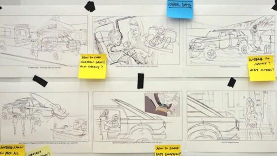 Авторы видео показывают сначала первые генерации внедорожника Ford Bronco, затем можно увидеть уже возрождённую модель, а также работу дизайнеров над созданием последней. В какой-то момент в кадрах появляется стенд с эскизами и здесь замечаешь какое-то «несоответствие», а всё дело в том, что авто нарисовано в не совсем привычном образе, а в виде пикапа.