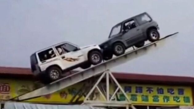 Видеоролик показывает совершенно невообразимый трюк на двух Geo Trakker, известных в нашей стране, как Suzuki Vitara. Интересно, что трюк делается на высоте несколько метров, а в салоне каждого из автомобилей сидит несколько пассажиров.