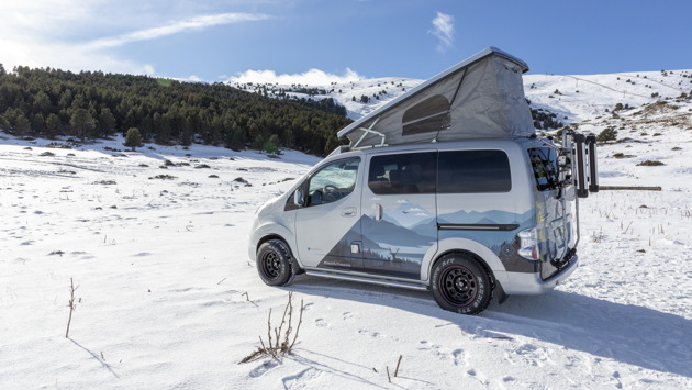 Кемпер e-NV200 Winter Camper предназначен в том числе и для зимних путешествий. У него увеличенный дорожный просвет. «Обут» автокемпер во внедорожные шины, а его кузов оснащён дверными ограждениями и боковыми дугами.