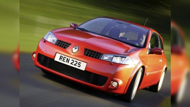 Лидером ТОПа стал хэтчбек Megane RS, представленный в середине «нулевых» французской автомобилестроительной компанией Renault. «Заряженная» версия оснащалась турбодвигателем рабочим объёмом 2 литра, генерирующим 225 «лошадей». На разгон до первой «сотни» авто требовалось 6,5 сек, а максимально хот-хэтч мог развивать до 240 км/ч.