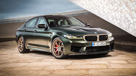 Как и ожидалось, новый BMW M5 CS получил бронзовое обрамление чёрной радиаторной решетки с логотипом M5 CS, а также L-образную переднюю лазерную оптику желтого цвета в стиле M8 Gran Coupe. Обули экстремальный седан в 20-дюймовые кованые колёсные диски бронзового цвета. Базовым цветом новой модели стал Brands Hatch Grey. Кроме того, спецверсию можно будет заказать с эксклюзивными матовыми оттенками Frozen Brands Hatch Grey и Frozen Deep Green.