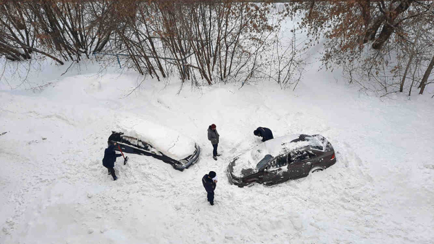 Снежная лавина накрыла парковку в Новосибирске: засыпаны две машины