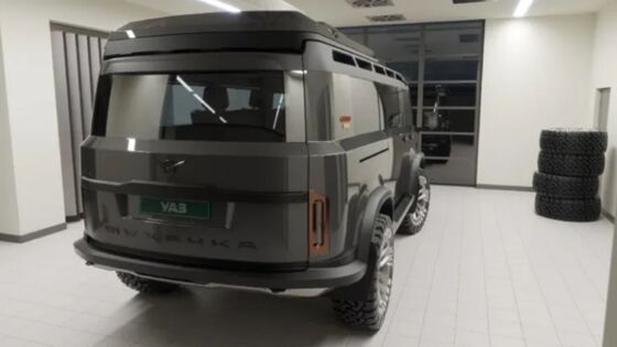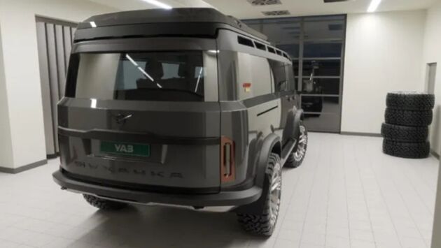 Новинка от специалиста имеет новые боковые двери, которые можно увидеть на микроавтобусах. Стоит отметить наличие мощных колес, по бокам которых находится надпись СССР. Соответствующие поздравления встречаются и на кузове тоже, который выглядит полностью новым. На крыше располагается багажный отсек, закрепляемый впечатляющими рейлингами.