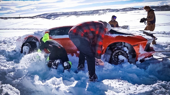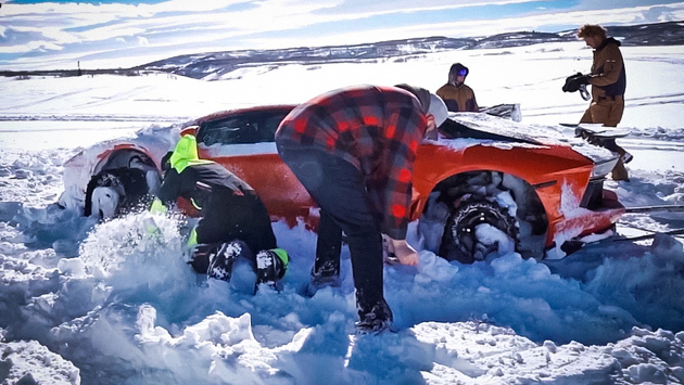 Из-за установки гусеничных механизмов Lamborghini стал гораздо шире. Поэтому первая проблема, которую пришлось решить энтузиастам заключалась в том, как спустить суперкар с транспортировщика. После нескольких попыток блогерам все-таки удалось поставить модифицированный Aventador на снежный покров.