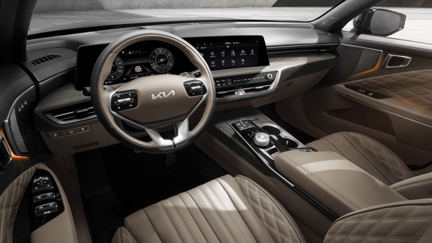 В салоне Kia K8 присутствует много атрибутов автомобилей премиум-класса. Например, перфорированная обивка сидений здесь выполнена из дорогой кожи «наппа», а декоративные вставки сделаны из натурального дерева и металлов. На передней панели установлен панорамный изогнутый дисплей, левая часть которого отведена под «приборку», правая — под мультимедиа. Сенсорный блок на центральной консоли заведует одновременно климатической установкой и информационно-развлекательной системой, причем переключаться между режимами можно одним нажатием кнопки.