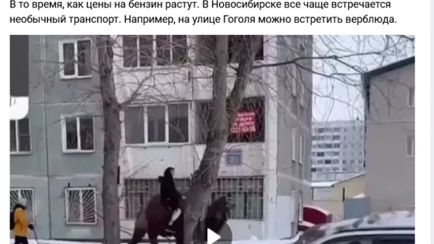 «В то время как цены на бензин растут. В Новосибирске всё чаще встречается необычный транспорт. Например, на улице Гоголя можно встретить верблюда», — говорится в описании к видео в группе «Новосибирск» в социальной сети «ВКонтакте».