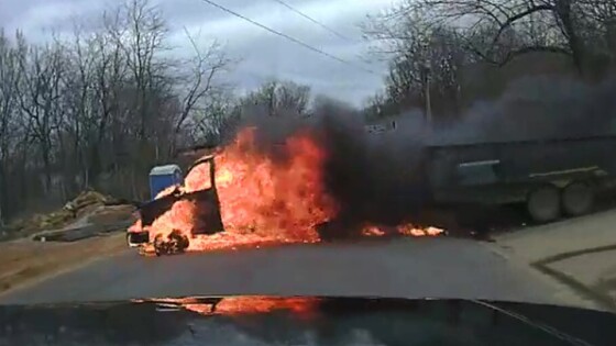 Видео: горящий фургон на полной скорости несется по склону в обрыв