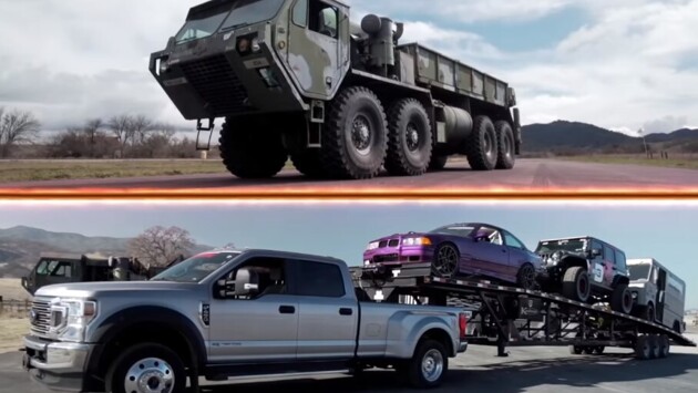 Чтобы не пришлось долго ждать, дрэг-гонку провели на дистанции 150 метров. В первом заезде Ford F-450 с автовозом практически сразу оторвался от преследователя, финишировав с большим отрывом. Вторая попытка также не увенчалась успехом для армейской машины. Груженный пикап снова стал первым, хотя и с меньшим гандикапом.