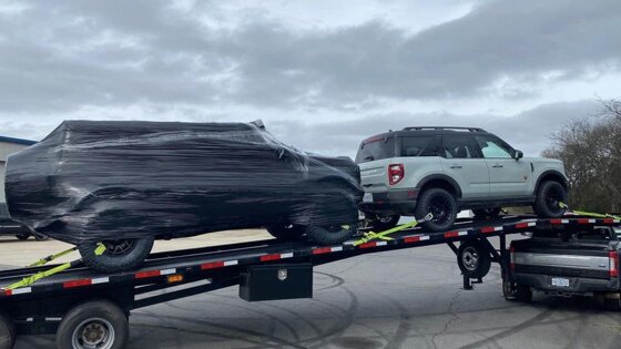 За последние несколько месяцев в Сети появилось немало шпионских снимков Ford Bronco Warthog. Но в этот раз автомобиль засняли, когда его перевозили на прицепе, причем ТС укрыли только пленкой, без какого-либо серьезного камуфляжа.