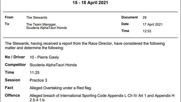 После субботней тренировки стюарды Гран При Эмилии-Романьи вызвали Пьера Гасли по обвинению в обгоне Антонио Джовинацци под красными флагами, что запрещено регламентом. Рассмотрев все обстоятельства, стюарды пришли к выводу, что непосредственно в момент обгона световая панель #5, мимо которой проезжал Гасли, ещё не горела красным. Уже после обгона гонщики увидели световую панель #6, которая светилась красным, в тот же момент получили от своих команд сообщение о появлении красных флагов и сбросили скорость. Поскольку фактически нарушения не было, никаких санкций к Гасли стюарды не применили.