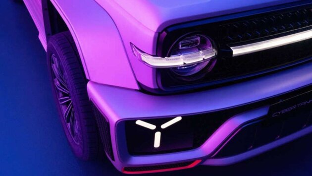 Футуристическая эстетика Cyber Tank имеет много общего с Mercedes G-Wagen . Помимо прямоугольных линий кузова, автомобиль получил очень широкую и плоскую переднюю панель, которая обрамлена массивными колесными арками. Несмотря на наличие тех же фар, что и у соотечественника, модель Cyber получила световую полосу спереди, которая соединяет обе фары в четкую линию, а также пару противотуманок Y-образной формы.