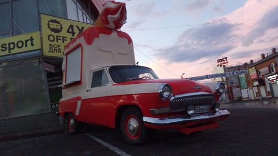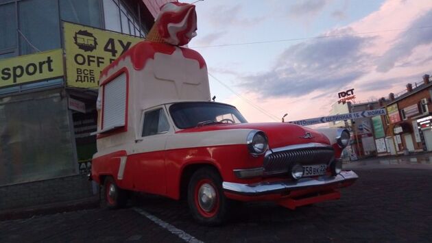 Продавец сообщает, что автомобиль предназначен для продажи мягкого мороженого и молочных коктейлей. Но его также можно переоборудовать для торговли кофе, хотдогами или бургерами. Правда придется поменять фигурку рожка на крыше на что-то соответствующее новому меню.