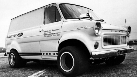 Ford Transit Supervan 1. Впервые данную модель представили в 1971 году на трассе Брэндс-Хэтч, которая располагается в Великобритании. Фургон строили специально для американского концерна. Во главе разработки стояло инжиниринговое предприятие Terry Drury Racing. За основу автомобиля взяли шасси спортивной версии Ford GT40. Заметим, что последняя является 4-кратным победителем в гонке 24 часа Ле-Мана. От спорткара также позаимствовали тормозные диски и рулевую систему.