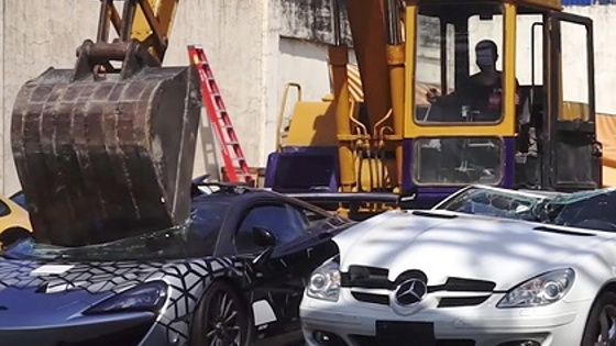 Согласно материалу, более 20 конфискованных спорткаров были уничтожены под ударами ковша экскаватора. Среди них были редкие машины, выпущенные тиражом в несколько сотен экземпляров.