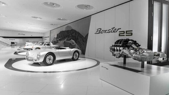 Автопроизводитель решил посвятить выставку этому автомобилю. Здесь представлено 25-летняя истории Boxster. Кроме того посетители могут узнать различную информации об автомобилях с центральным расположением мотора, которые использовались уже в 1948-м году.