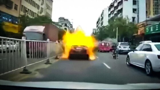 ДТП успели снять на видео на одной из улиц Китая. Автомобиль просто начал взрываться на ходу, причем второй взрыв оказался мощнее первого, а затем уже вспыхнувшая модель взорвалась еще раз.