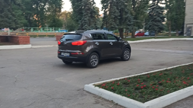 На фото виден автомобиль KIA Sportage с номерным знаком А155АВ 164, совершающий маневры на пешеходной зоне.