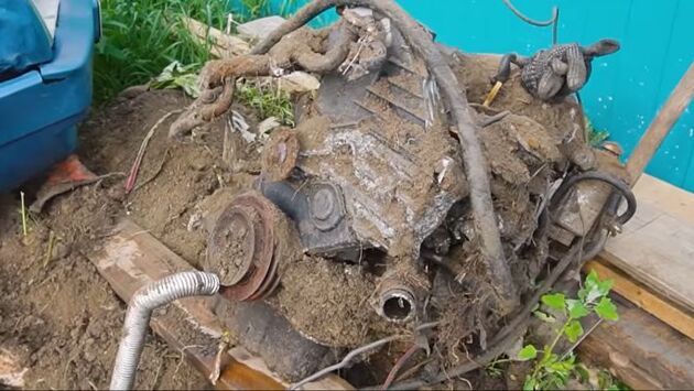 Совсем недавно срок эксперимента истек, и настало время откапывать двигатель. Оказалось, что агрегат не прогнил и сохранился в довольно неплохом состоянии. Но что насчет его работоспособности? Чтобы выяснить это, мотор попытались завести.