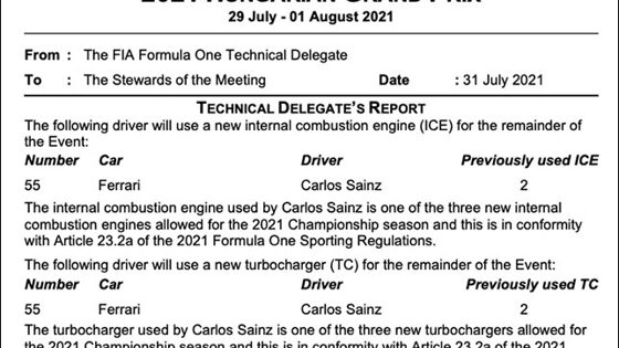 В FIA подтвердили замену элементов силовых установок на четырёх машинах. Карлос Сайнс получил новый двигатель внутреннего сгорания, турбину, MGU-H и выхлопную систему. Макс Ферстаппен получил новый блок управляющей электроники. Серхио Перес и Эстебан Окон тоже будут использовать новую выхлопную систему. Все замены в рамках разрешений регламента, никаких санкций не последует.