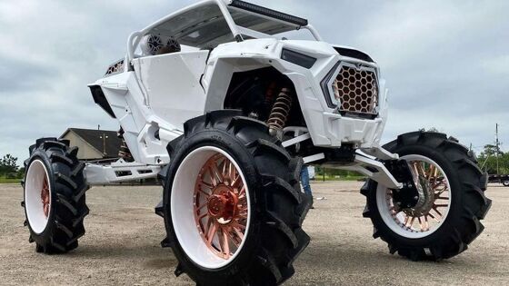 Доступной информации немного, поэтому мы даже не знаем точную модель колес Forgiato. По крайней мере, мы знаем, что этот RZR сильно приподнят над дорогой при помощи передней подвески в форме арки и портальных осей.