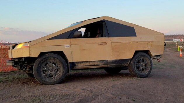 Итог. Энтузиаст разработал реплику электрокара Tesla Cybertruck из фанеры. Данный автомобиль был построен для участия в ралли Grambler 500. За движение транспорта отвечает двигатель внутреннего сгорания, позаимствованный у донора.