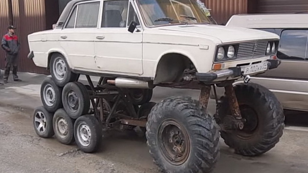 Умельцы с российского YouTube-канала «Гараж-54» сделали «Жигули» с семью мостами и 14 колесами. В новосибирской мастерской приварили к задней части «шестёрки» трапецию из пяти мостов, причём двигатель приводит в движение только одну ось, а десять колёс вращаются за счёт трения. Спереди установили мост от УАЗа с 42-дюймовыми колёсами от ГАЗ-66, а рулевые тяги удлинили. На получившемся монстре сделали пробную поездку.