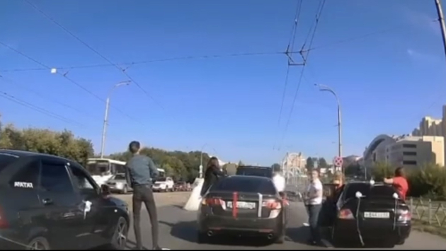 По словам автолюбителей, машины свадебного кортежа перекрыли три полосы движения, после чего на дорогу вышла невеста и начала позировать для фото. Инцидент произошел в воскресенье, 5 сентября, на проспекте Ленина у Искитимского моста.