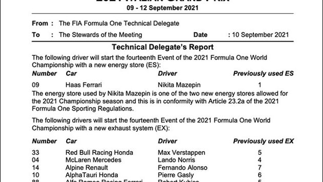 В FIA подтвердили замену элементов силовых установок на семи машинах. Никита Мазепин утром в пятницу получил второй накопитель энергии. На машину Ландо Норриса поставили пятую выхлопную систему из восьми разрешенных, Макс Ферстаппен, Роберт Кубица и Антонио Джовинацци получили шестую, Пьер Гасли – седьмую, а Фернандо Алонсо – восьмую. Никаких санкций за это не последует.
