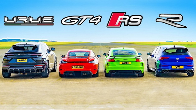 YouTube-канал carwow устроил дрэг-гонку между купе Audi TT RS и Porsche Cayman GT4, хот-хэтчем Volkswagen Golf R и кроссовером Lamborghini Urus. Спорткары концерна Volkswagen сразились в заездах с места на четверть мили, провели пару гонок с хода с 50 миль в час (80 километров в час) на дистанциях в полмили и милю, а финальным тестом была оценка эффективности тормозных механизмов со скорости 70 миль в час (113 километров в час).