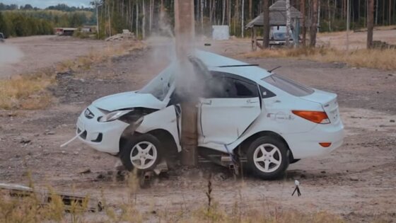 Hyundai Solaris — краш-тест со столбом на скорости 55 км/час