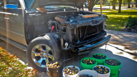 Владельцу пикапа пришлось потратить несколько часов, чтобы разобрать всю переднюю часть пикапа, снять капот и крылья, в также извлечь семь 20-литровых вёдер, доверху наполненных орехами. По словам мужчины, даже после тщательной очистки моторного отсека в недрах подкапотного пространства все ещё находятся несколько орехов, звук перемещения которых он слышит во время движения.