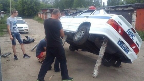 Чтобы починить полицейский автомобиль, местные мастера не придумали ничего лучше, чем подпереть его деревянными брусками.