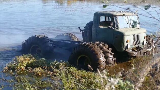 Чтобы испытать советский грузовик водой, блогерам пришлось немного модернизировать его. Они хотели, чтобы 3,5-тонный автомобиль поплыл, а для этого ему требовалось сразу шесть колес. Причем не стандартных, а огромных тракторных. Водоизмещение каждого из них составляет 700 килограммов, а совокупно — 2,8 тонны. Этого должно было хватить, чтобы «шишига» смогла пересечь водоем.