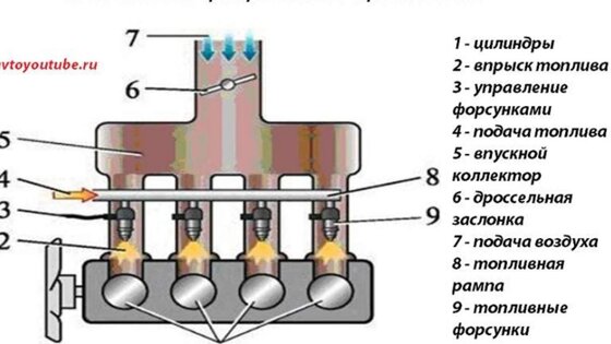 Распределенный впрыск - MPI. Этот вид впрыска не является первым в своей категории, и не он заменил устаревший карбюратор. До этого существовал моновпрыск, при котором горючее проходило всего через одну форсунку. Управление у такой системы было электронного типа - при помощи сигналов датчиков, но никаких плюсов, в сравнении с карбюратором, не отмечалось. Дело в том, что главный дефект не прошел - горючее оставалось на стенках коллектора в виде осадка. Поэтому специалисты начали развивать распределенный впрыск.