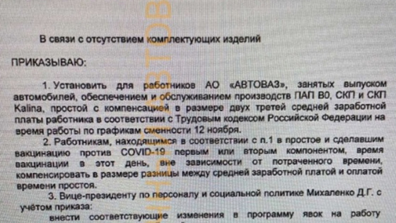 «АвтоВАЗ в связи с отсутствием электронных компонентов 12 ноября приостановил производство автомобилей на всех трех сборочных линиях в Тольятти. Сборка LADA Granta велась лишь 9 ноября, LADA Largus и XRAY, Renault Logan и Sandero собирали с 8 по 11 ноября включительно, а для LADA Niva вся неделя окажется нерабочей», — говорится в информации.