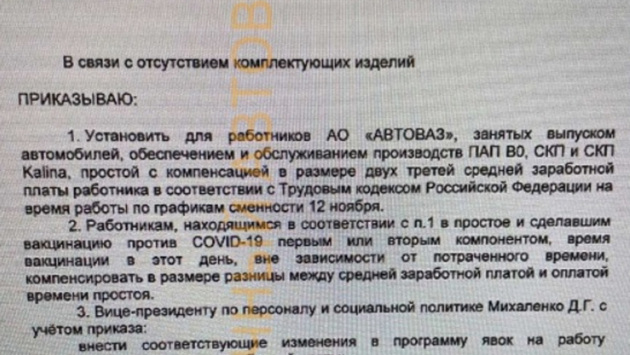 Отмечается также, что из-за простоя работникам предприятия выплатят компенсацию в размере двух третей средней зарплаты. При этом завод «LADA Ижевск», производящий автомобиль LADA Vesta, продолжает работу.
