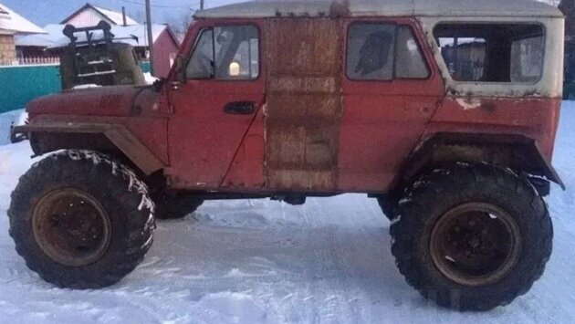 Бигфут из подручных средств. Растянутый УАЗ на колёсах от трактора с жестяной дверью от туалета посредине. Не понятно, зачем был сделан, в итоге стал достопримечательностью родной деревни.