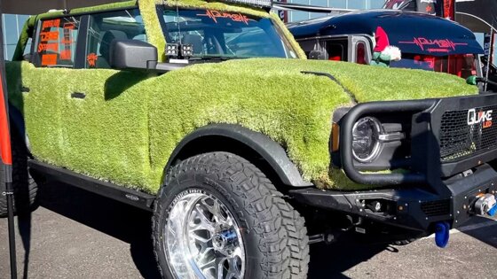 Но больше всего взглядов на мероприятии было приковано вовсе не к эффектным трюкам и ярким шоу-карам, а к обыкновенному внедорожнику Ford Bronco с живым кузовом. В прямом смысле этого слова. На всех внешних кузовных панелях автомобиля растёт самый настоящий мох.