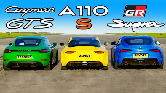 Британский YouTube-канал carwow устроил дрэг-гонку между Porsche 718 Cayman GTS 4.0, Toyota GR Supra A90 и Alpine A110 S. Заднеприводные купе с турбомоторами и разными типами коробок передач посоревновались на прямой — победителя выявили после стартов с места на четверть мили, параллельных заездов с хода с 50 миль в час (80 км/ч) на полмили, а финальным испытанием была оценка эффективности тормозов со 100 миль в час (161 км/ч).