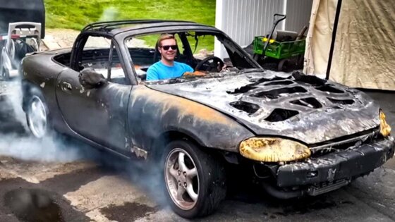 Mazda Miata "с дымком"! Японская легенда осталась на ходу после пожара, а сейчас её восстанавливает фанат-механик.