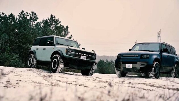 Очевидно, что в плане мощности американец проигрывает англичанину, но у детища Ford есть неоспоримое преимущество перед моделью от Land Rover. Всё дело в том, что для этого теста взяли Bronco с пакетом Sasquatch, который помимо всего прочего включает в себя 35-дюймовые грязевые шины. Авто сразились в перетягивании каната на запорошенной снегом пересечённой местности.