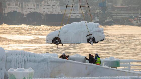 Сухогруз Sun Rio зашел во Владивосток с иномарками, покрытыми льдом не только снаружи, но и изнутри. Японские машины доставили морем из Южной Кореи при неблагоприятных погодных условиях, из-за чего авто и палуба заледенели.