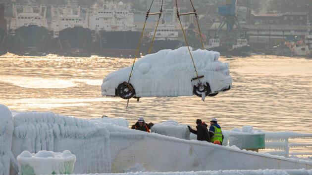 Необычное зрелище привлекло внимание жителей краевого центра 27 декабря. Толстым слоем льда покрыты Honda, Toyota и другие иномарки. Моряков произошедшее не удивило. Дело в том, что зимой подобное может происходить из-за того, что вода попадает на авто и вскоре замерзает, таким образом, на машинах образуется ледяная корка. Процессу обледенения способствует сильный ветер, из-за которого вода и попадает на борт.