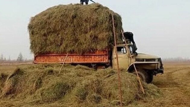 Безусловно, Урал - машина очень мощная. Но если посмотреть на фото, то стог в кузове давно уже превысил размеры самого грузовика.