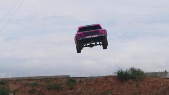 Очень эффектно выглядят прыжки внедорожника через двухполосные автодороги. Транспортное средство на большой скорости несётся по эстакадам.