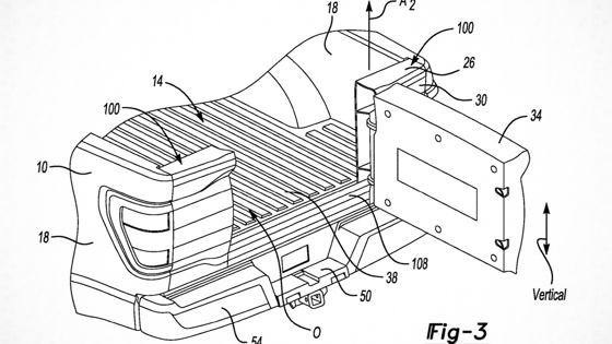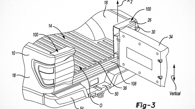 Работа системы открывания заднего борта продемонстрирована на примере F-150. Борт имеет три секции: можно откинуть все три вниз либо открыть среднюю секцию вбок, как дверь. Из документов следует, что такая конструкция получит название Flexbed.
