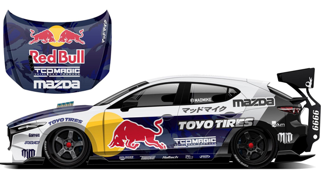 Никакой информации о новой машине «Безумный Майк» пока не раскрыл, опубликовав лишь тизер модели на своей странице в Instagram. Судя по описанию, хэтчбек Mazda3 получит четырёхкамерный роторный двигатель мощностью 1200 лошадиных сил, а также четырёхместный салон. Правила Pikes Peak International Hill Climb запрещают находиться в автомобиле кому-то, кроме водителя, поэтому новинку, как ожидается, в дальнейшем дрифтер будет использовать в показательных заездах.