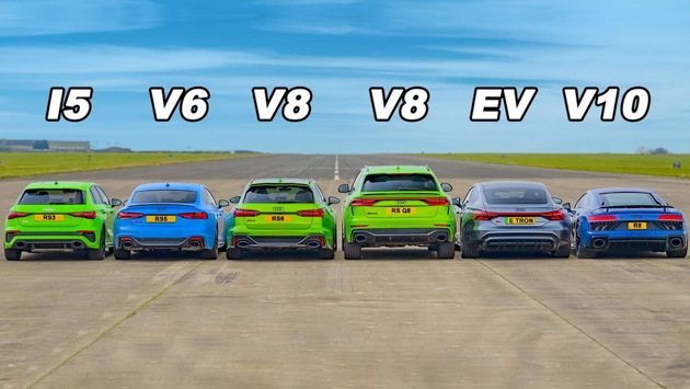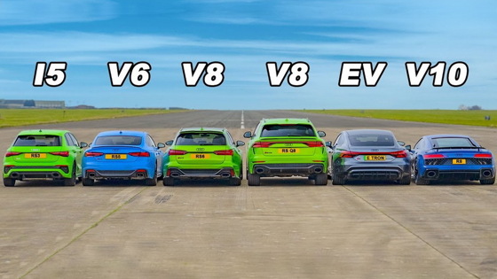 YouTube-канал carwow сравнил в дрэге шесть разных моделей Audi Sport. Против суперкара R8 и электроседана RS e-tron GT выставили хот-хэтч RS 3 Sportback, лифтбек RS 5 Sportback, суперуниверсал RS 6 Avant и кроссовер RS Q8. Бензиновые модели с пять, шестью, восемью и десятью цилиндрами противостояли электрокару в заездах с места на четверть мили, параллельных стартах с хода на полмили и милю, а финальным испытанием была оценка эффективности тормозов.