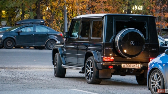 В этом авто G-класса самым ярким интересным элементом выступают 23-дюймовые диски колёс с потрясающим дизайном. Ещё транспортное средство отличается двухцветной окраской и изобилием хрома.